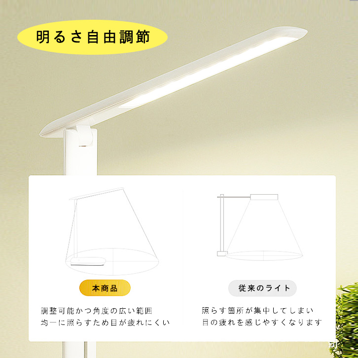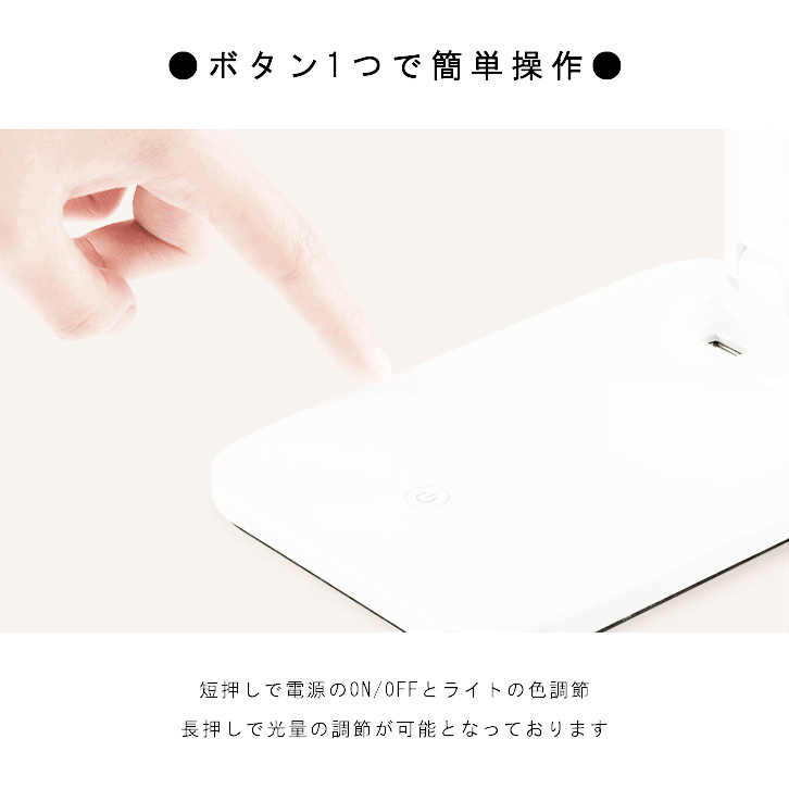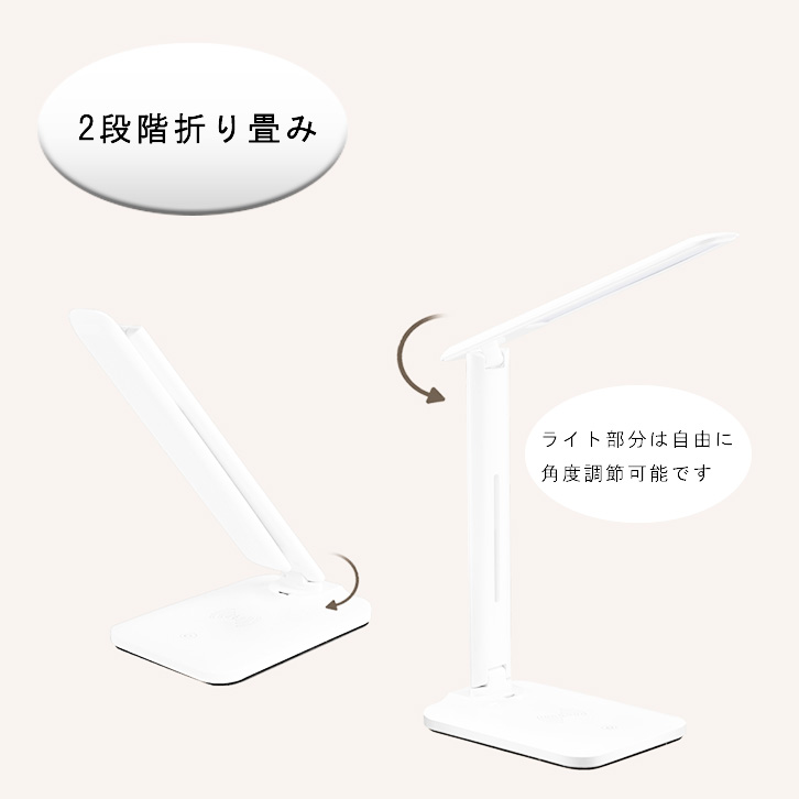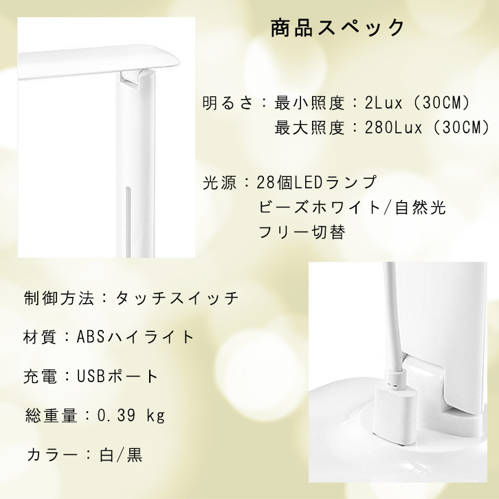 【本体カラー】ホワイト/ブラック 【明るさ】最小照度:2Lux(30CM)/最大照度:280Lux(30CM) 【光源】28個LEDランプ/ビーズホワイト/自然光 【充電】USBポート 28個の電球で明るく卓上を照らします。 2段階折り畳み可能♪ライト部分は自由に角度調節出来ます。