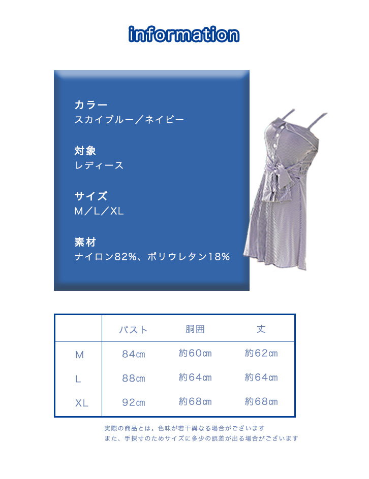 【カラー】スカイブルー/ネイビー 【サイズ】M/L/XL 【素材】ナイロン82%/ポリウレタン18% お腹周りのカバーに。一体型のワンピースは、お腹周りもしっかり隠して激しく動いてもめくれる心配がないのが嬉しい!