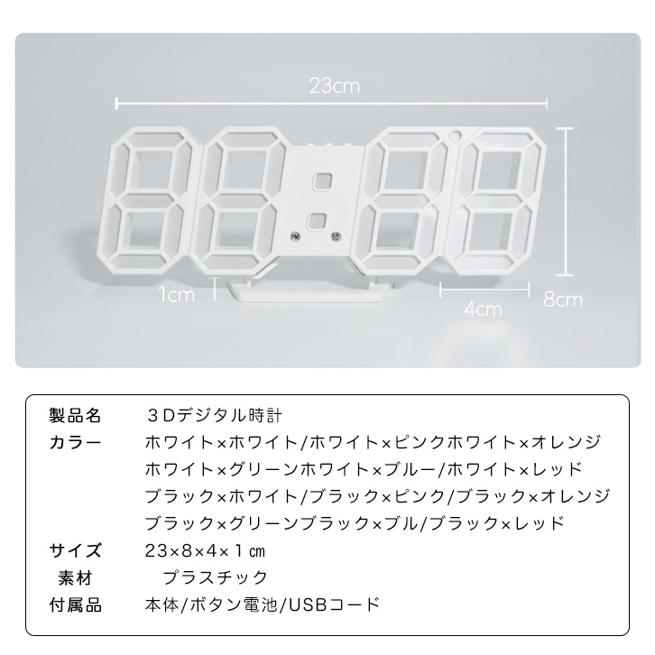 デジタル時計 3Dデジタル時計 時計 置き時計 明るさ調節可能 明るさ3段階調節 LED点灯式 明るい 暗闇でもハッキリ見える かっこいい かわいい スタイリッシュ インテリア置き時計 全12タイプ