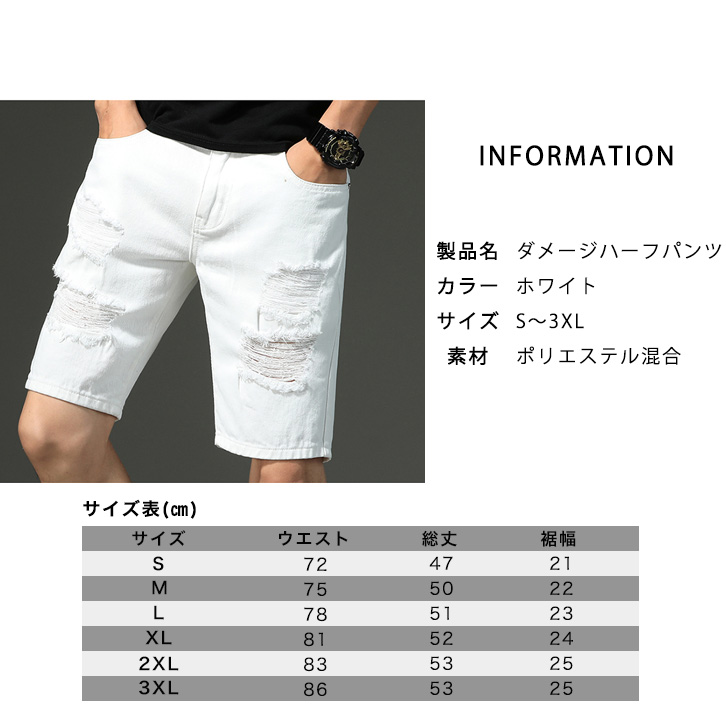 クラッシュ デニム ショーツ ハーフパンツ メンズ ハーフパンツ 白 ホワイト メンズ ダメージ加工 デニムショーツ 短パン ハーフパンツ デニム ショーツ 半ズボン 夏物 夏服 メンズファッション カジュアルパンツ