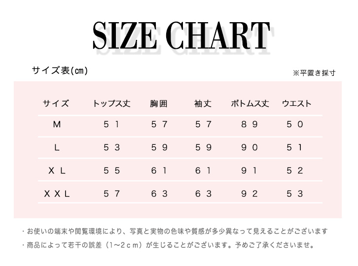 XL:トップス丈55/胸囲61/袖丈61/ボトムス丈91/ウエスト52