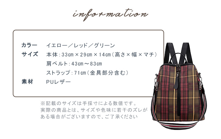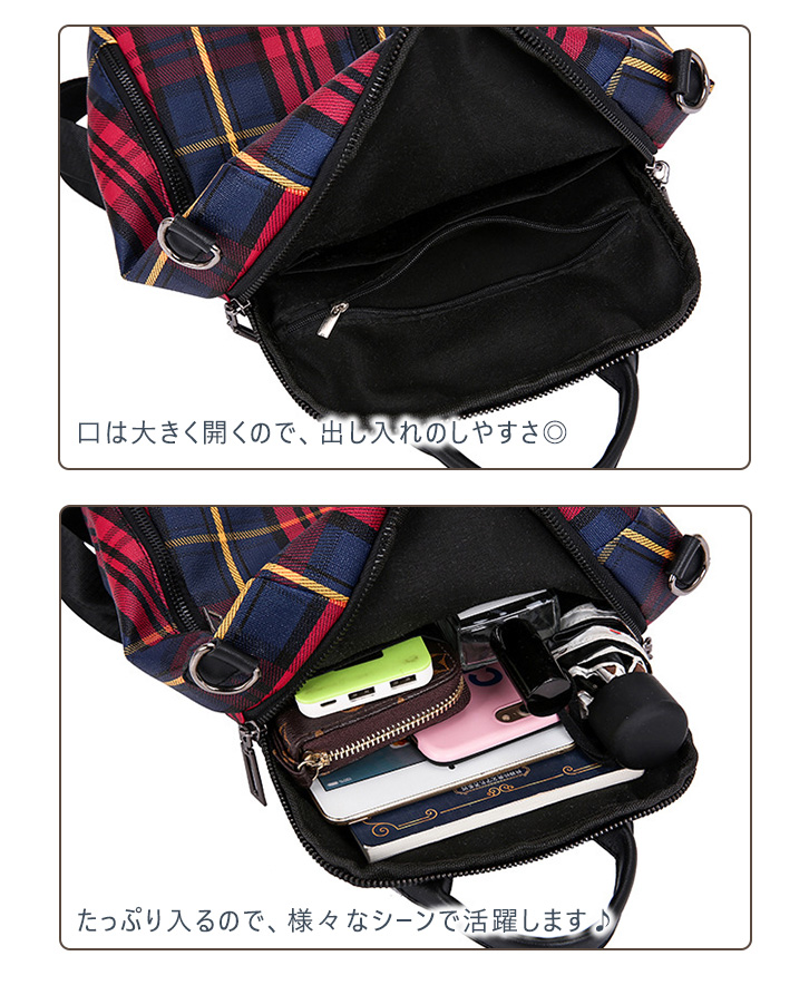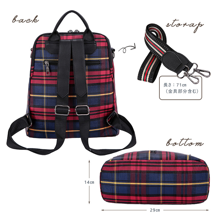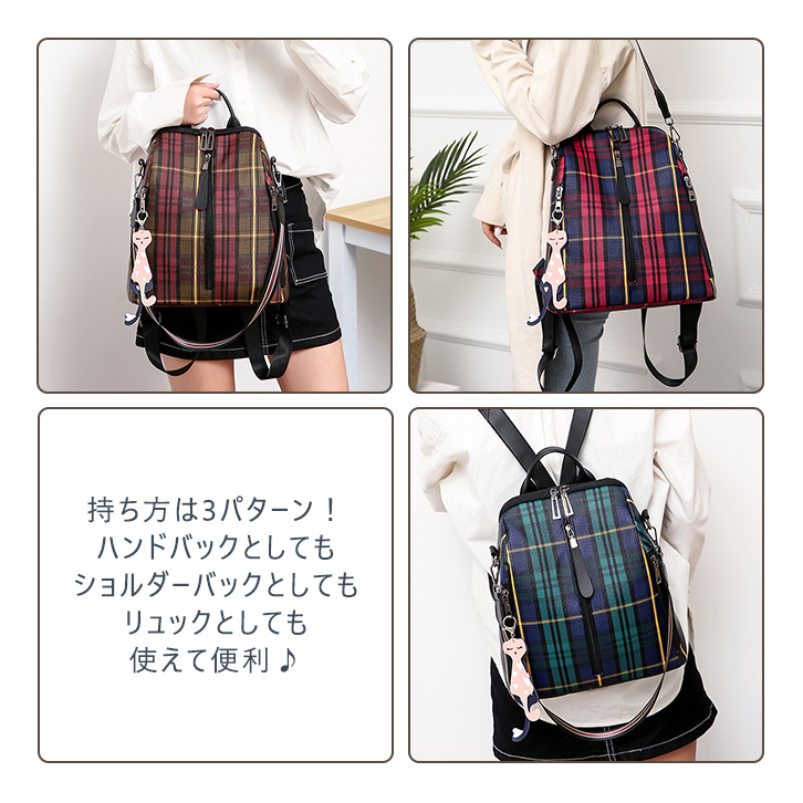 リュック バックパック レディース リュックサック チェック 3wayリュック レディースリュック チェック柄 タータンチェック 可愛い オシャレ アンティーク クラシック ショルダーストラップ取り外し可能 ファスナー開閉 肩ベルト調節可能