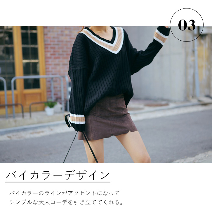 バイカラーデザインの深めVネックで大人可愛さをUP☆