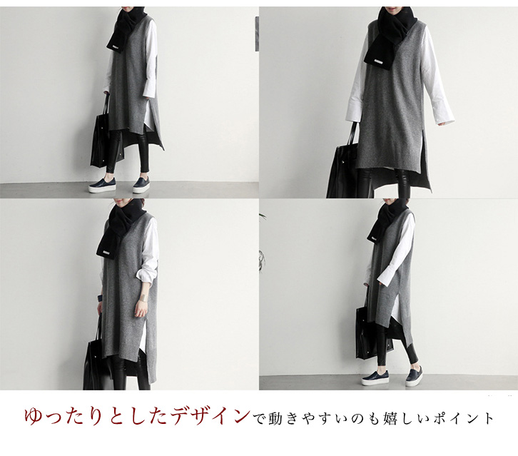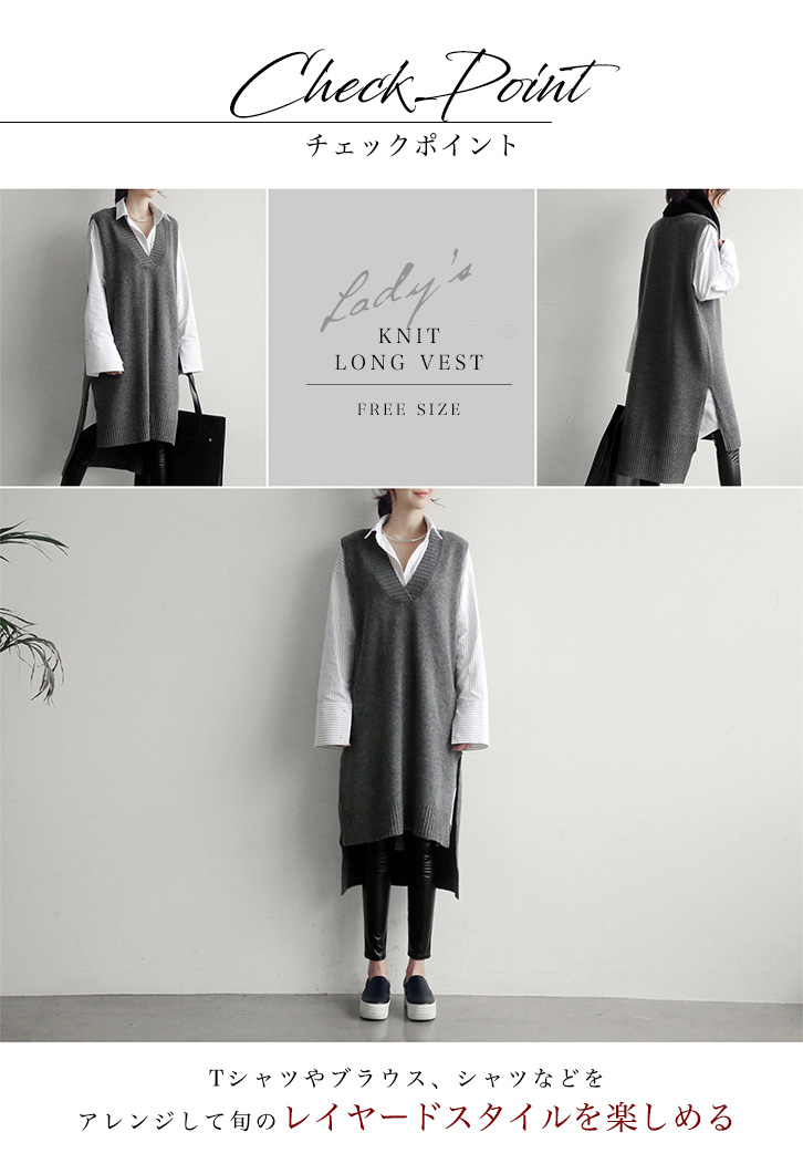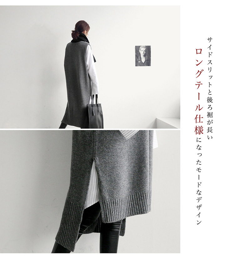 ベスト ニット レディース ロングニットベスト ロング丈 シンプル カジュアル フリーサイズ グレー ブラック 着回し抜群 アレンジ自在 重ね着 レイヤードスタイル サイドスリット ロングテール仕様 モード 大人カジュアル ゆったり
