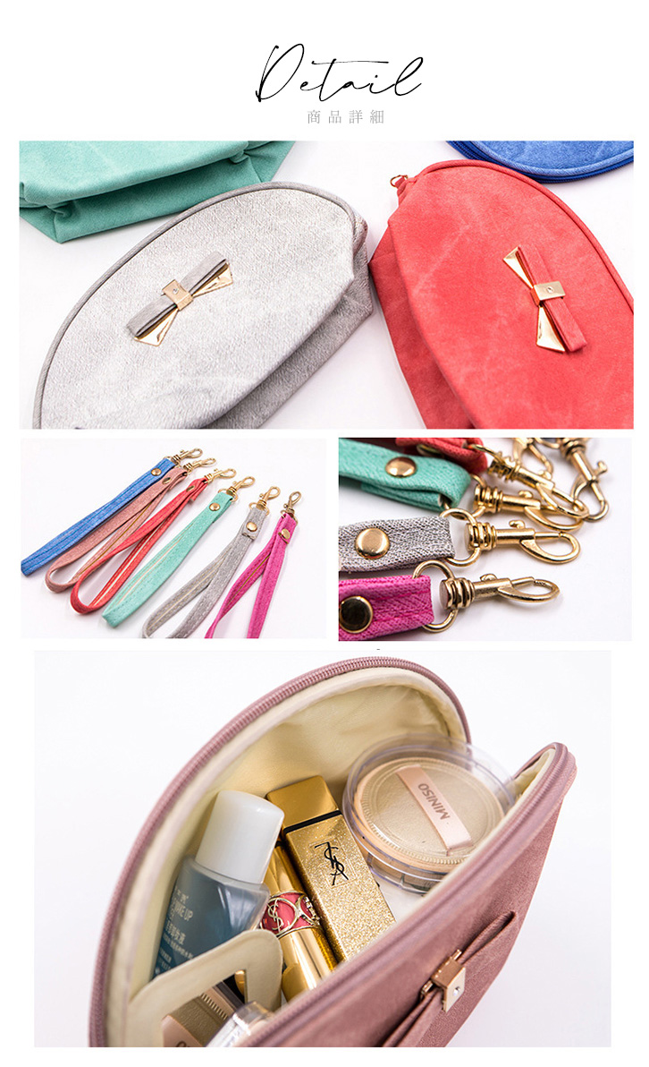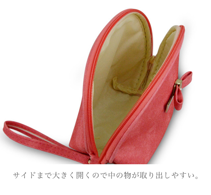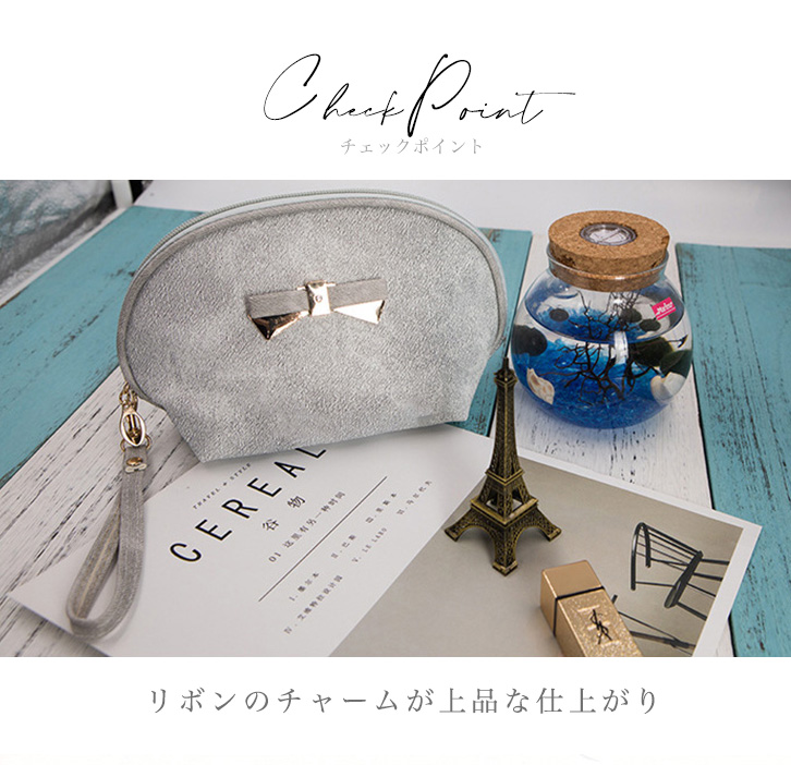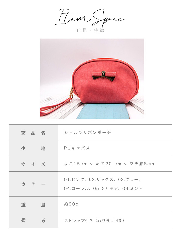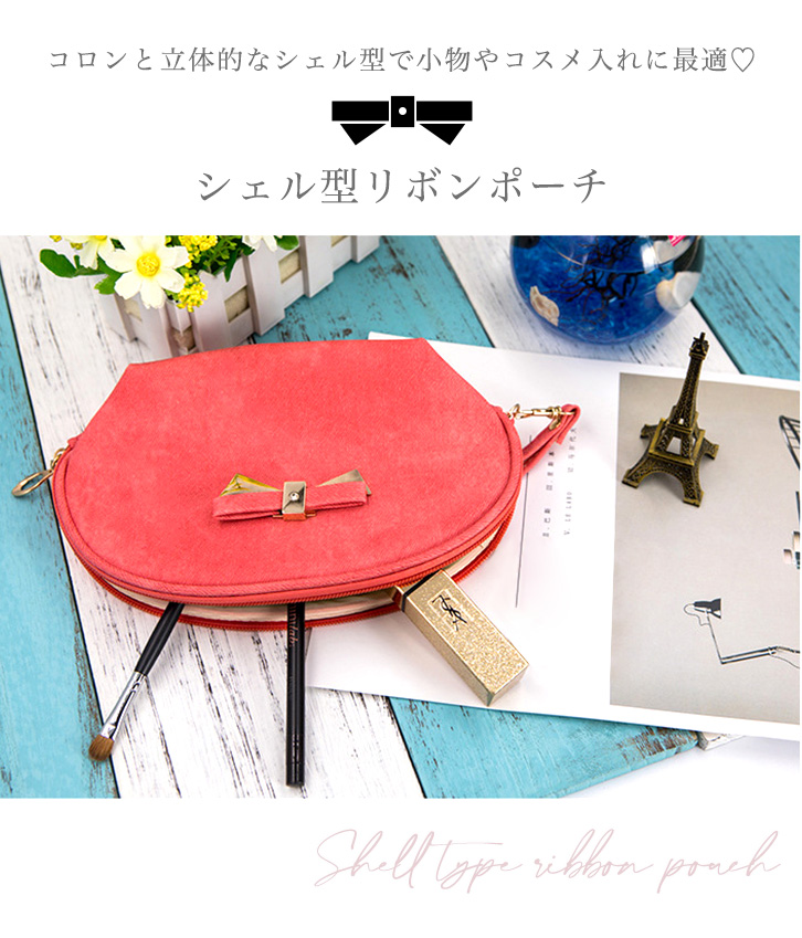 ポーチ コスメポーチ 小物入れ 多機能ポーチ シェル型 リボンポーチ かわいい ストラップ付き 大きく開く カラー豊富 カラーバリエーション豊富 ピンク サックス グレー コーラル シャモア ミント 旅行 コスメ入れ 小物