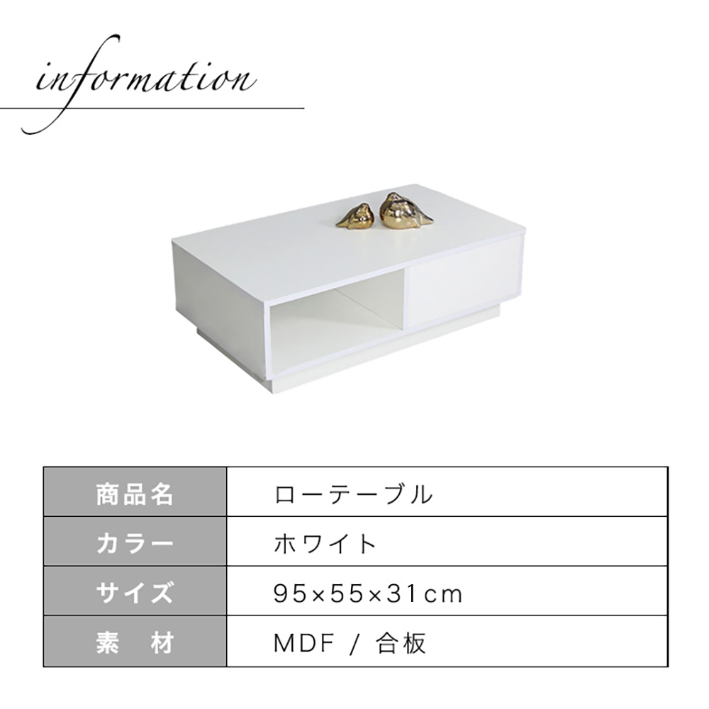 テーブル ローテーブル センターテーブル リビングテーブル ホワイト 白 長方形 コーヒーテーブル 幅95cm 高さ31cm 奥行55cm 引き出し付き 引き出し table スタイリッシュ モダン 上品 高級感 収納付き 収納力抜群 オープン収納 新生活 シンプル おしゃれ 読書 作業机