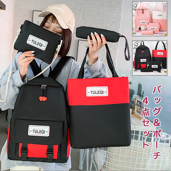 バッグ リュック トートバッグ ショルダーバッグ ペンポーチ 4点セット バックパック リュックサック おしゃれ かわいい 通学 習い事 学校 ガーリー 収納力抜群 ハートチャーム付き かわいい ピンクホワイト ブラックレッド