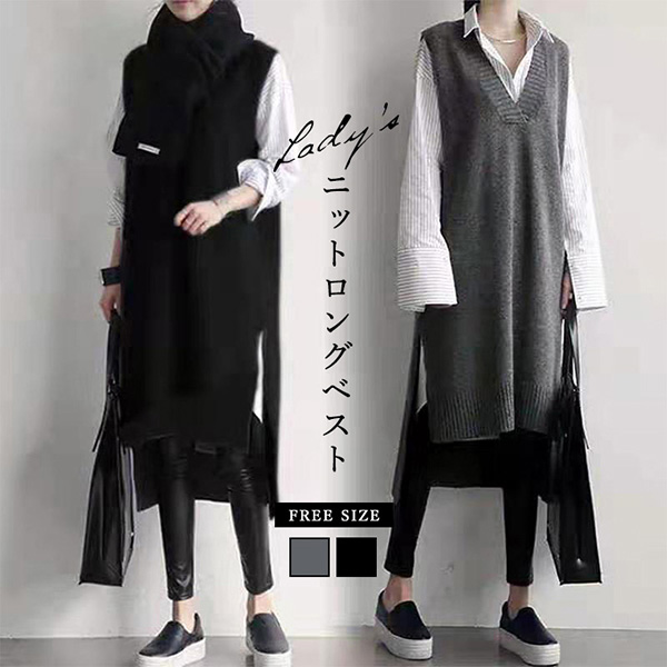 ベスト ニット レディース ロングニットベスト ロング丈 シンプル カジュアル フリーサイズ グレー ブラック 着回し抜群 アレンジ自在 重ね着 レイヤードスタイル サイドスリット ロングテール仕様 モード 大人カジュアル ゆったり