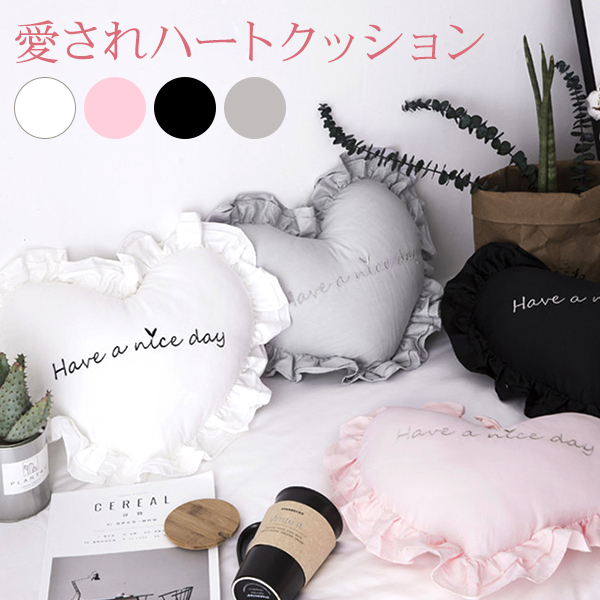クッション ハートクッション ハート ハート型 フェミニン 乙女 女子力アップ 可愛い キュート ハートデザインクッション ロゴ入り 二重フリル ハートフリルクッション インテリア 筆記体ロゴ かわいい ホワイト ピンク グレー ブラック