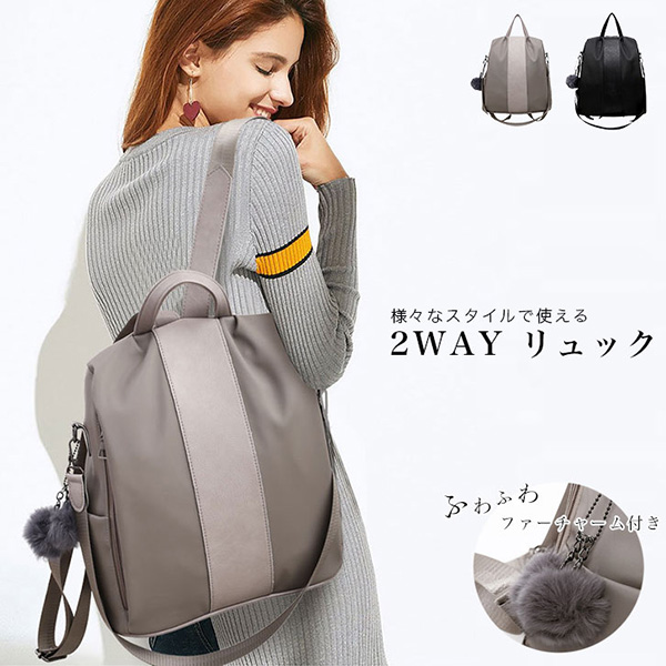 リュック トートバッグ 2wayバッグ 便利 ファーチャーム付き ショルダーストラップ調節可能 サイドポケット付き 大容量 収納力抜群 内ポケットあり 全2色 ブラック ベージュ PUレザー