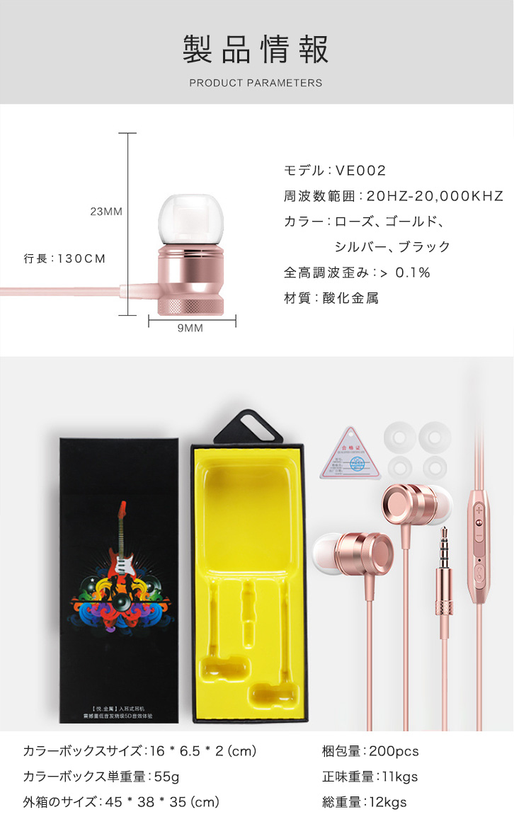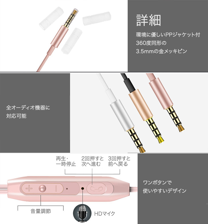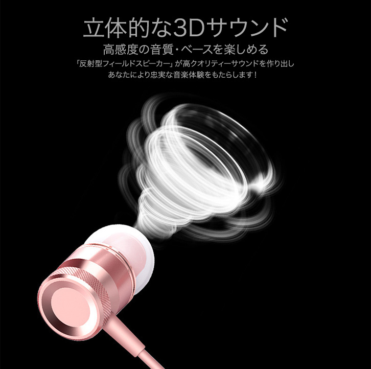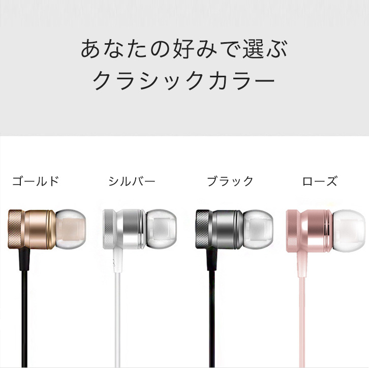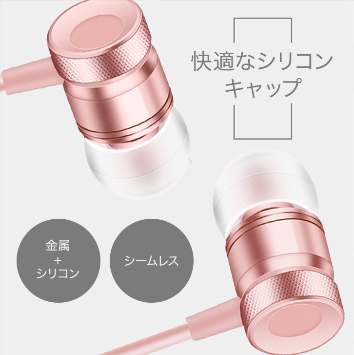【カラー】ローズ/ゴールド/シルバー/ブラック 【機能】マイク付きリモコン搭載でiPhoneやスマートフォンでの通話可能 音量調整などの各種操作にも対応 カナル型イヤホンのため、耳にピッタリフィット。 メタル調で高級感もありカラーも豊富なため 男性女性共にお使いいただけるデザインになっております。