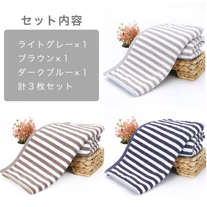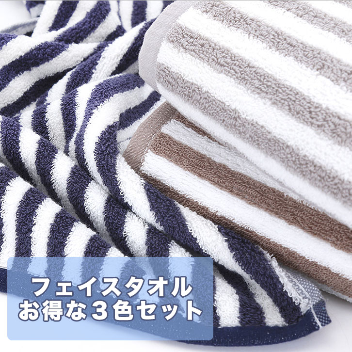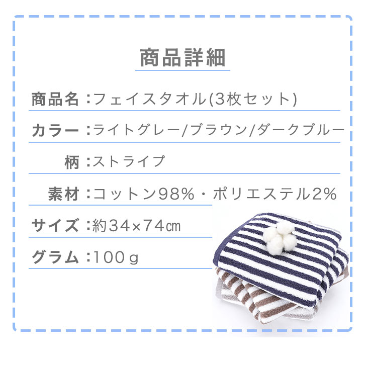 フェイスタオル3枚セット 素材:コットン98%/ポリエステル2% サイズ:1枚当たり約34×74cm/100g セット内容(カラー):ライトグレー/ブラウン/ダークブルー/計3枚セット