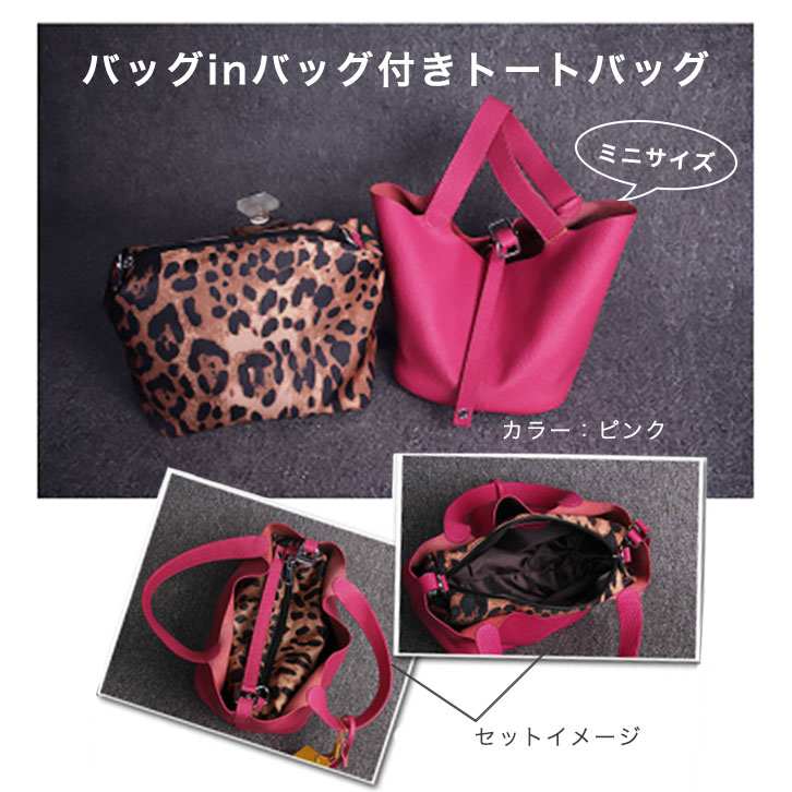 【カラー】ブラック/ピンク 【サイズ】約W26×H20×D20cm 今流行りのヒョウ柄!!!! バッグINバッグ付き♪♪♪ 街歩きにピッタリなミニハンドバッグは、 シボ感のあるフェイクレザーを使用しており高見え&傷がつきにくく使いやすい☆ そして、シンプルなデザイン! 500mlのペットボトルも収納可能でコンパクトな見た目ながら大容量です。