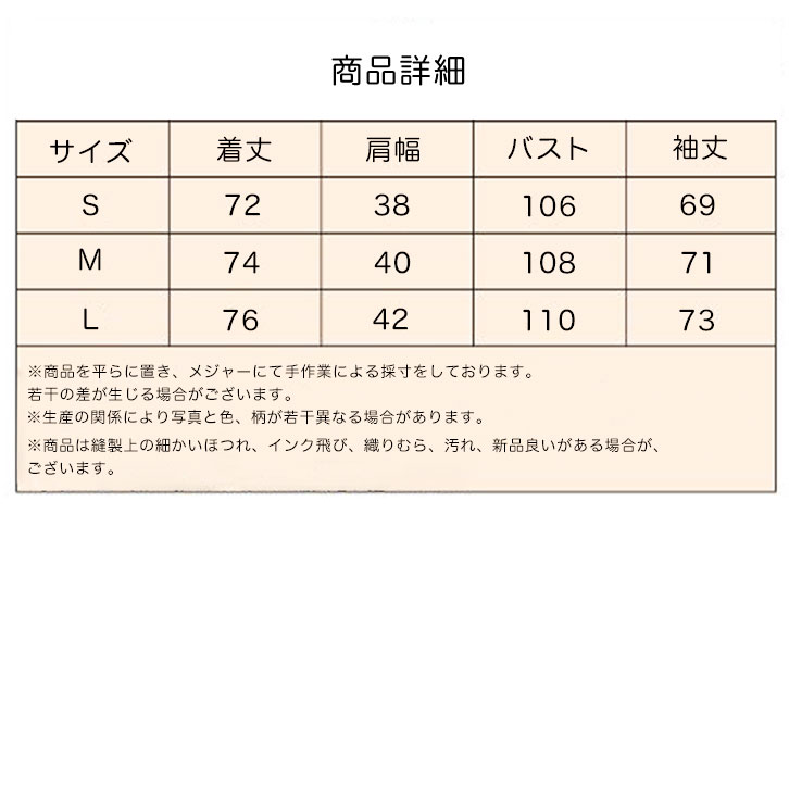 S:(約)肩幅38cm/バスト106cm/袖長69cm/着丈72cm