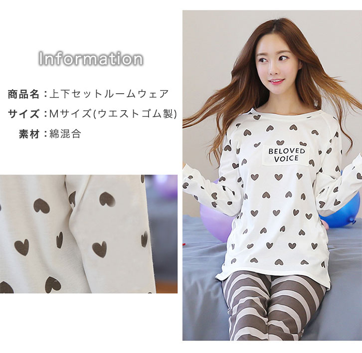 【サイズ】M 長袖のトップスとロングパンツがセットになった ルームウェアになります♪ 鎖骨に沿って緩やかな曲線を描くボートネックタイプの首元なので 見た目がスッキリします♪♪ 首元が詰まっているルームウェアが苦手な方にも◎ デザインはハート×ボーダー柄で可愛いデザインですが カラーはシンプルなため甘すぎず大人可愛くなります♪♪ 【問い合わせ商品コード】 aqua-u-sa-005