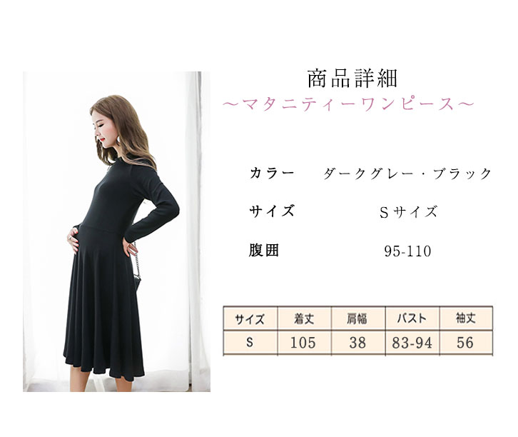 【カラー】ブラック・グレー 【サイズ】Sサイズ 腹囲 95-110 着丈105 肩幅38 バスト83-94 袖丈56 シンプルなデザインでストレッチ素材で お腹の負担軽減♪ ゆったりとしています♪ お出かけの普段着や パーティードレスとしてもOK♪