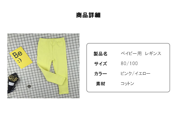 【カラー】イエロー/ピンク 【サイズ】80/100 【素材】綿 柔らかい肌触りの生地のキッズレギンスになります♪ ストレッチが効いて動きやすく ボタンやジッパーがないからお着がえもカンタン楽々♪♪ パステルカラーで可愛く合わせやすく 防寒対策にもばっちりです♪♪ 【問い合わせ商品コード】 aqua-ya-shi-007