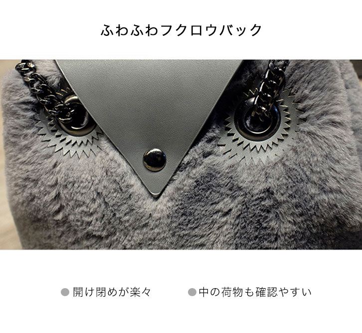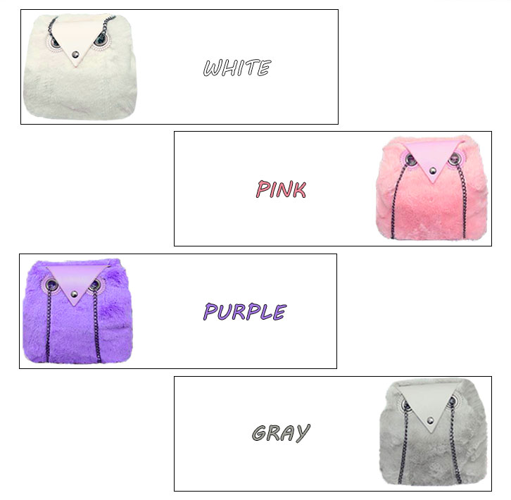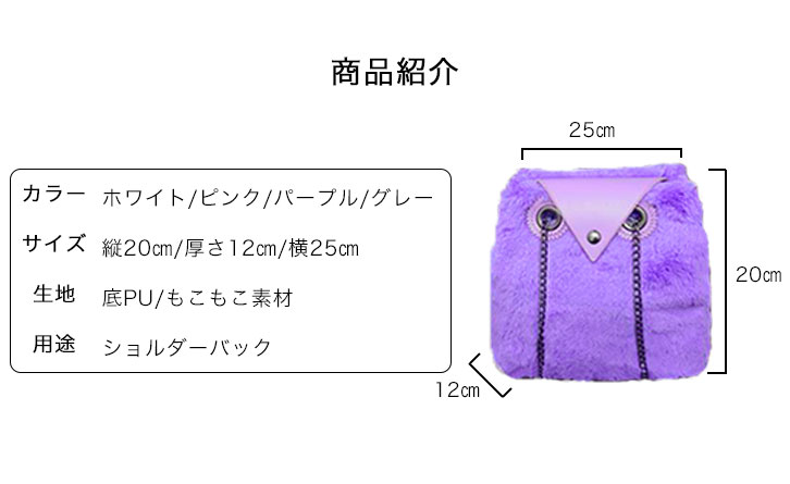 【カラー】ベージュ/パープル/グレー/ライトピンク 【サイズ】高さ約18cm/底幅約20cm/厚さ約13cm フクロウがとってもかわいい肌触りのよい モコモコ素材のバッグになります♪♪ 人と被りがちなファーアイテムも キュートでユニークなデザインだから 注目されること間違いなし☆☆ 開口部もがばっと大きく開くから 中も見やすく取り出しやすいデザインになっています♪ 【問い合わせ商品コード】 aqua-ki-no-030