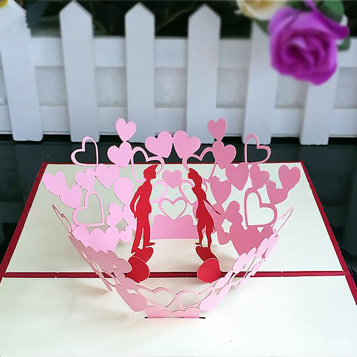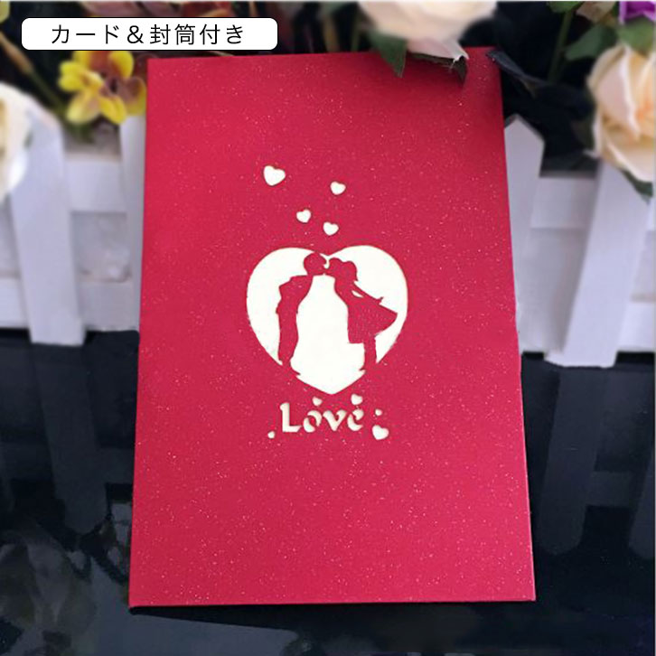 開くとキスする恋人と大きなハートが飛び出すしかけのポップアップカード。