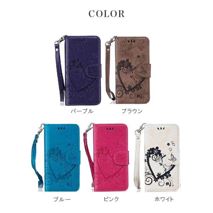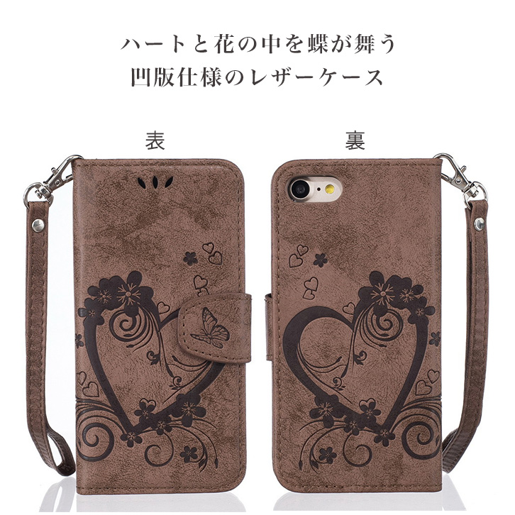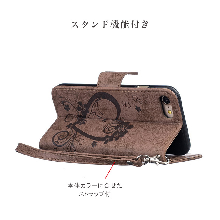 iPhoneケース 手帳型 アイフォン 手帳型ケース カードポケット付き かわいいハート花柄 蝶柄 型押し花柄 選べるカラー ストラップ付 横置きスタンド機能 スマホカバー 二つ折り 耐衝撃 カラバリ豊富