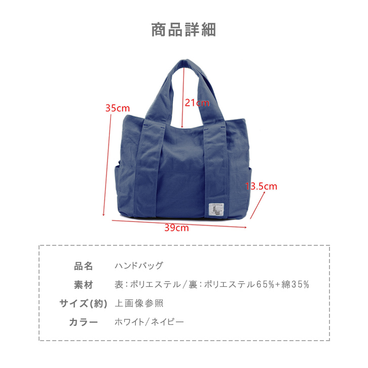 【カラー】ホワイト/ネイビー 【サイズ】約W39×H35×D13.5cm 【素材】キャンバス キャンバスの大きめのトートバッグです。 シンプルなデザインで飽きがこず、流行に左右されずに長く使っていただけます♪ 【問い合わせ商品コード】 aqua-sa-ju-006 出品素材はこちら
