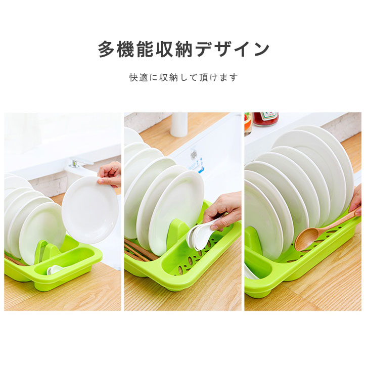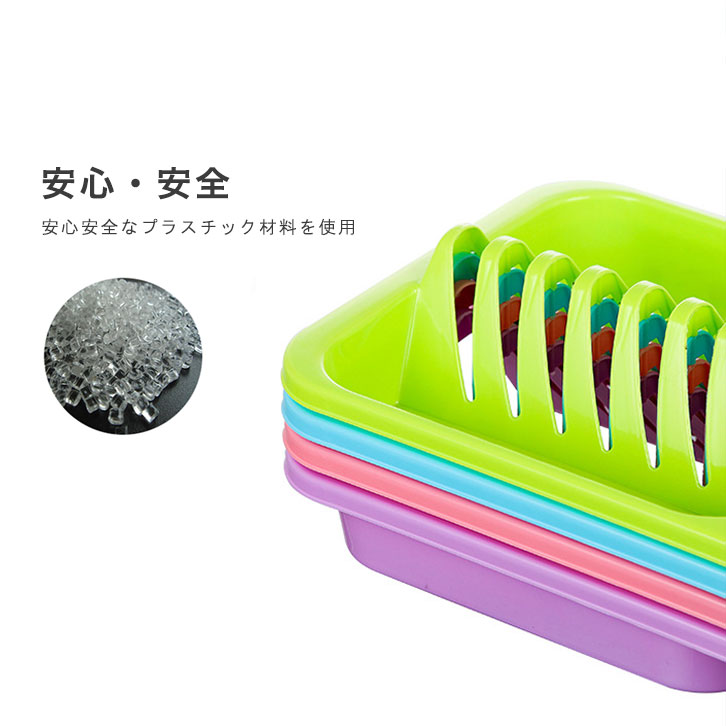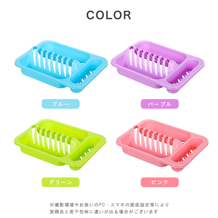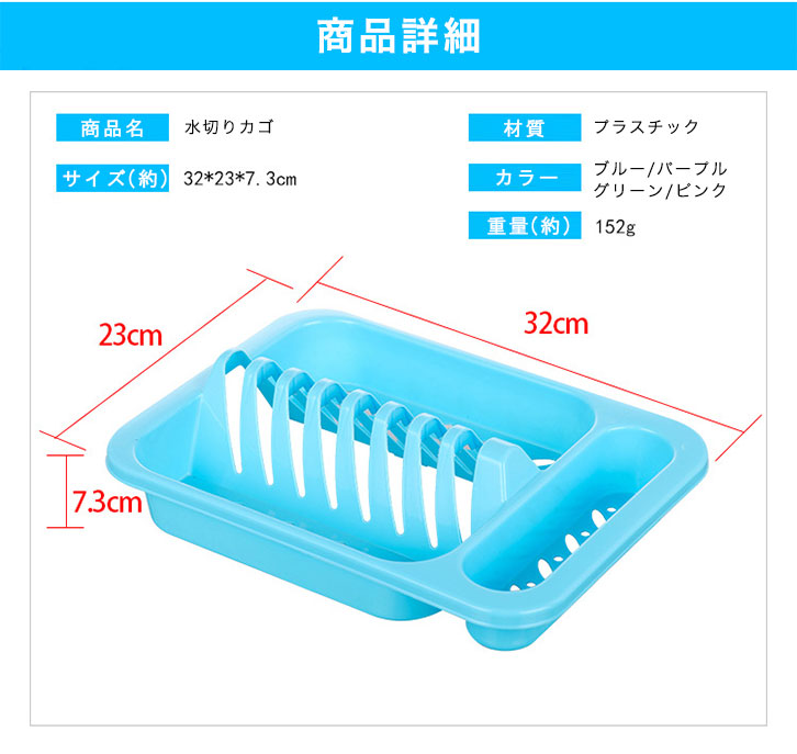 【カラー】ピンク/グリーン/パープル/ブルー 【サイズ】約32×約23×高さ約7.3センチ ※多少誤差が生じる場合がございます。 ご了承ください。 丈夫なプラスチック製でサビの心配もいらない 水切りかごになります♪ お皿を重ねることなく、 立てて収納が出来るので出し入れもとても簡単です。 スプーン類は分けて入れることが出来るので便利♪ ※受け皿は付属ではございません