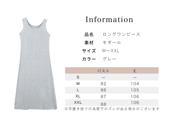 【カラー】グレー 【サイズ】M/L/XL/XXL (約)バスト:82/86/87/88 丈:104/105/106/106 【素材】モダール 軽やかな生地でふんわり揺れるノースリーブロングワンピース♪ 軽やかかつ柔らかな素材感でさらっと涼しく着られるロングワンピース。 ネックラインはデコルテが綺麗に見えるラウンドネックで女性らしさUP。