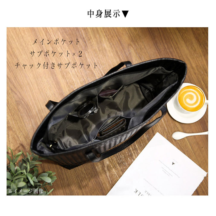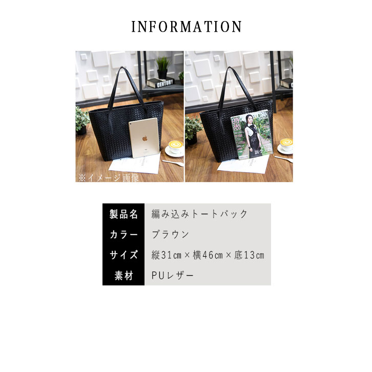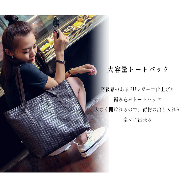 【カラー】ブラック/ブラウン 【サイズ】幅約34×高さ約31×マチ約12.5センチ ※多少誤差が生じる場合がございます。 ご了承ください。 【素材】PU A4サイズもすっぽり入る! 大容量トートバッグです♪ 見た目もオシャレな編み込みメッシュで 高級感もUP☆ ファスナー仕様で中身もしっかりガードしてくれます。 何かと荷物が多い女子にはぴったりのアイテム☆ デザインもシンプルなので通勤や通学にも◎