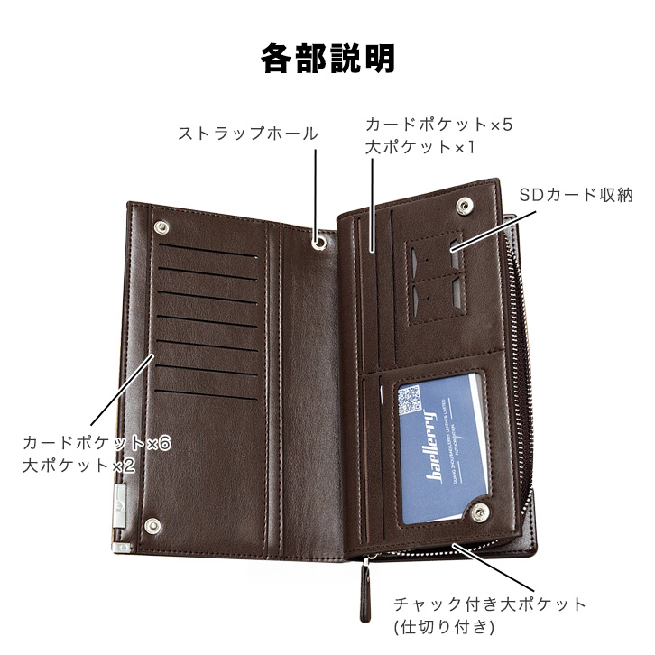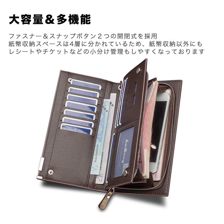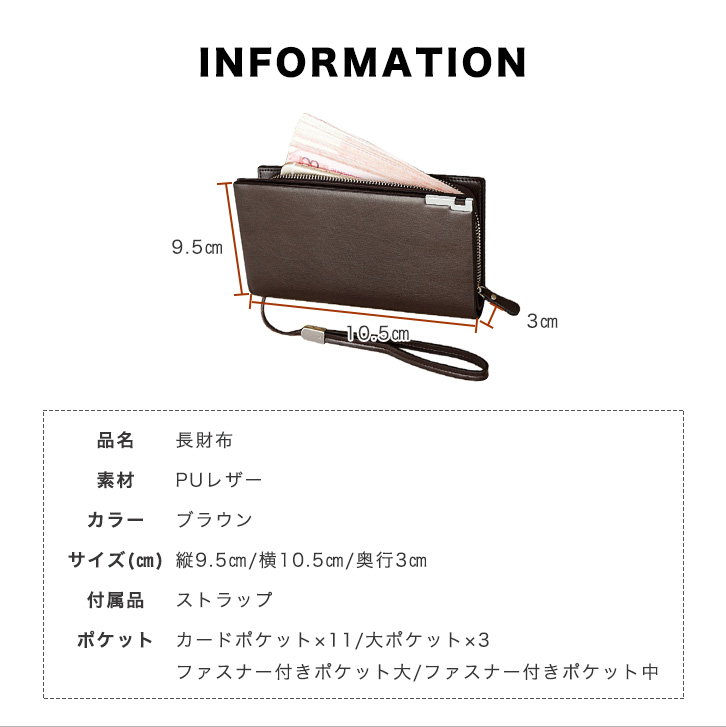 【カラー】ブラウン 【サイズ】約W10.5cm/H9.5cm/D3cm 【ポケット】カードポケット×11/大ポケット×3/ファスナーポケット大、中 大容量&多機能長財布♪ ファスナー、スナップボタン2つの開閉式を採用。 高級PUレザー素材、ストラップ付属♪品のある質感、手触りに仕上がっております。