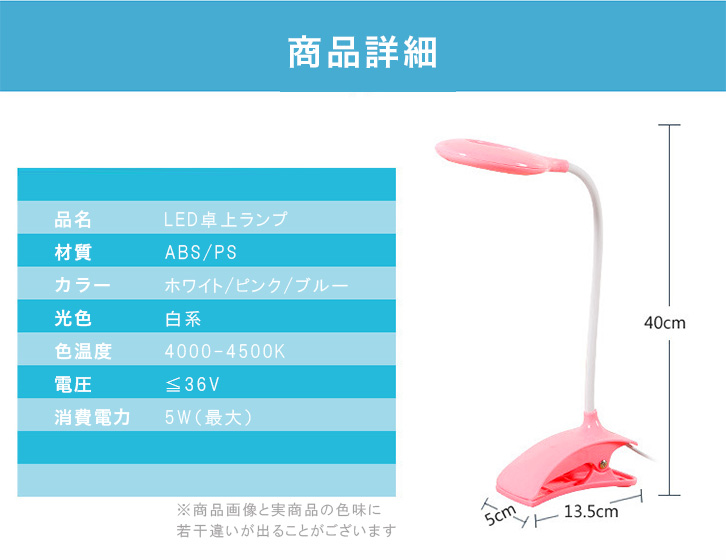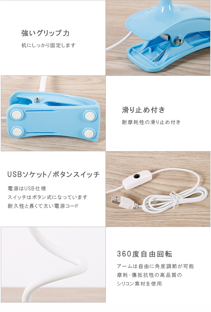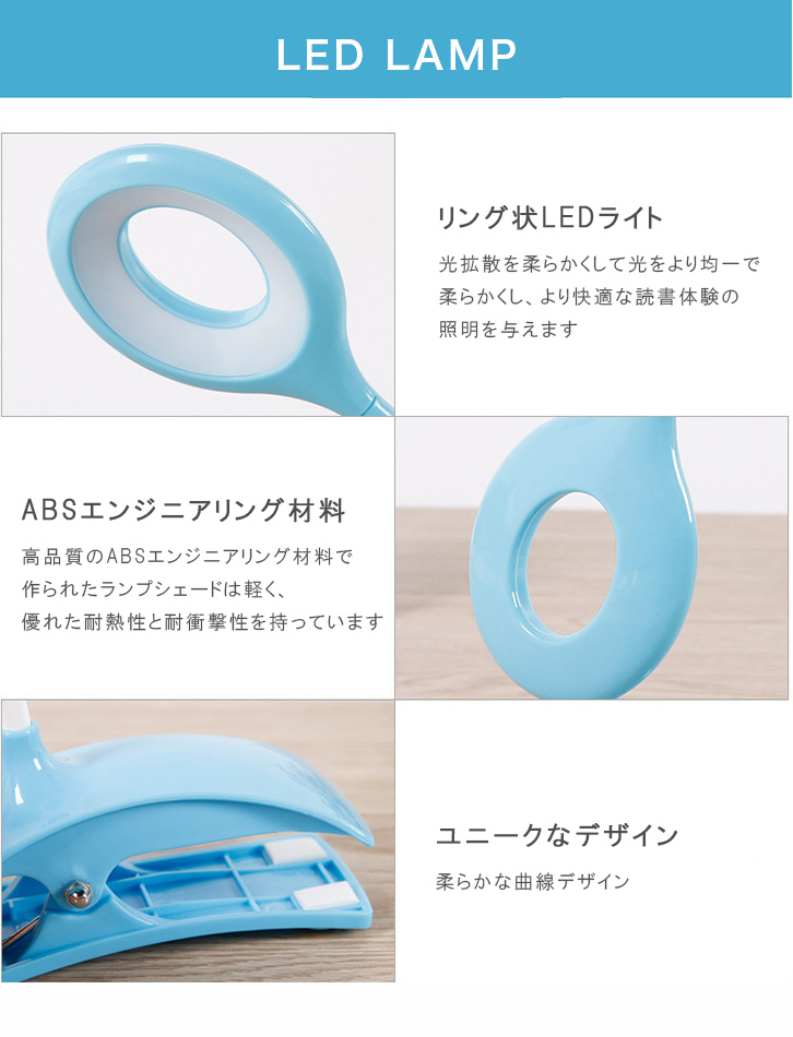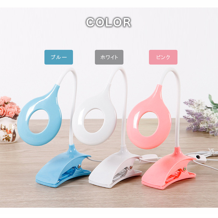 LEDライト 卓上ライト LEDランプ クリップタイプ USB接続 リング状ライト 曲線デザイン 角度調節可能 ブルー ホワイト ピンク