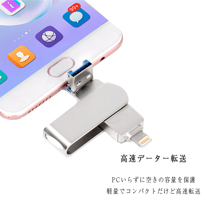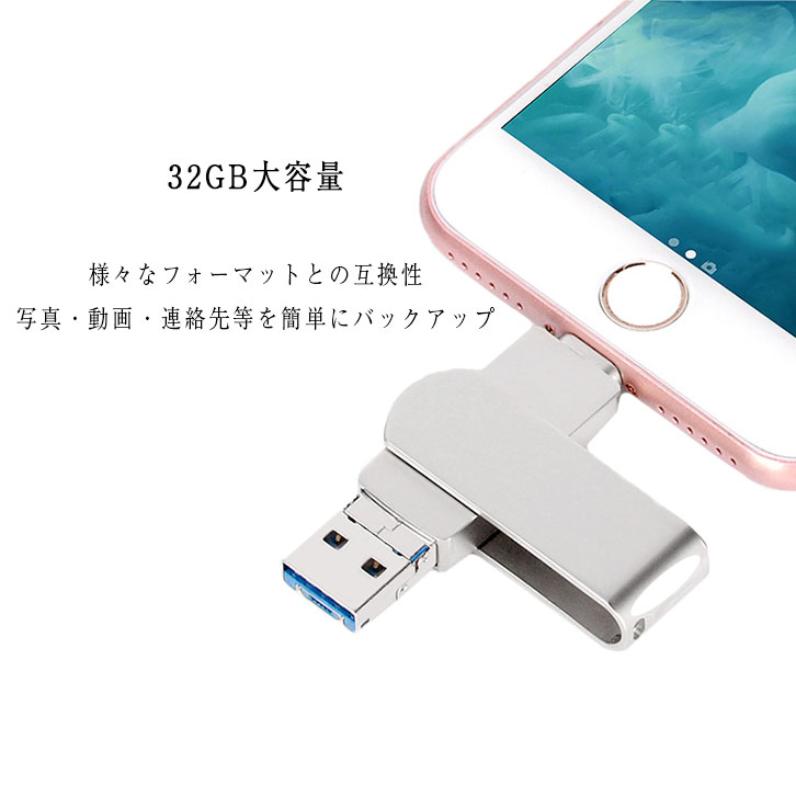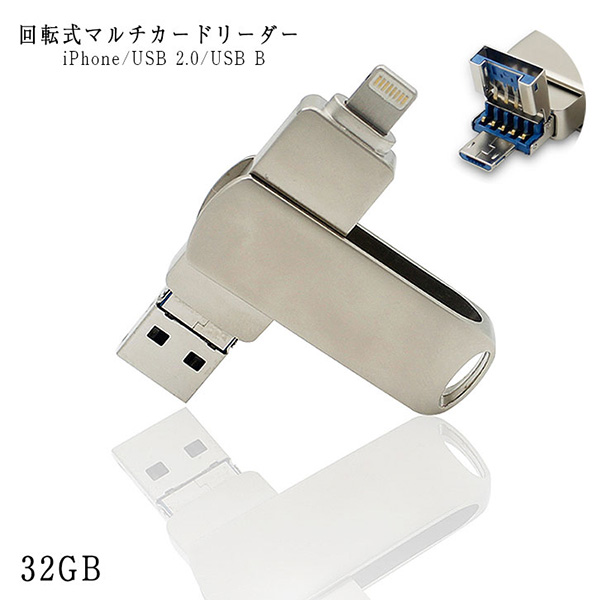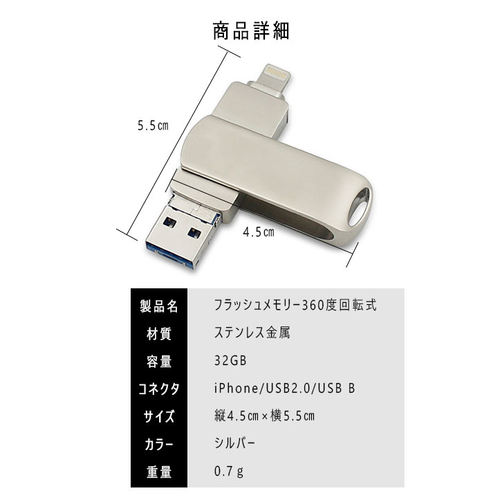 【カラー】シルバー 【材質】ステンレス金属 【容量】32G 【コネクタ】iPhone/USB2.0/USB B 【サイズ】約4.5cm/5.5cm 【重量】0.7g 回転式デザイン保護キャップ インターフェースの傷を防ぎます♪ データのバックアップ等に最適♪ 軽量でコンパクトだけど高速データ転送。