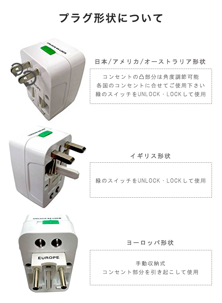 様々な国に対応! 海外旅行の必需品のマルチ変換プラグになります♪ コンパクトなので旅行や出張などの際の 持ち運びにも便利♪♪ これ1つで様々な国のプラグに対応! 世界中たくさんの国で使っていただけます♪♪ ※変圧機能はございません。 本品はプラグ形状の変換器です。