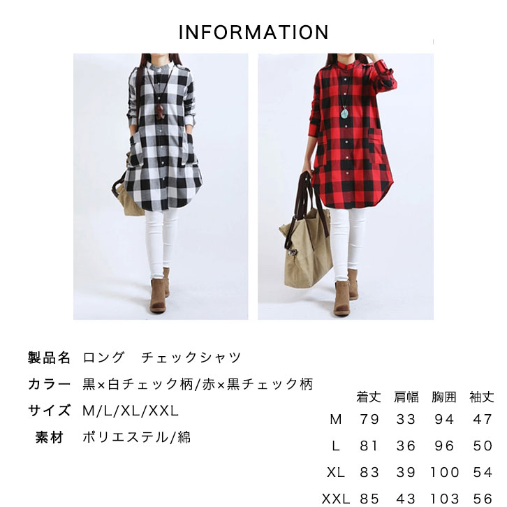 【カラータイプ】黒×白チェック/赤×黒チェック 【サイズ】M/L/XL/XXL ※比較的小さめのおつくりになっております。 普段来ているサイズよりも1~2サイズほど大きいものをおすすめいたします。 定番デザインのチェック柄ロングシャツになります♪ 色々なコーディネートにも合わせやすく 長い時期着て頂けるロングシャツになります♪♪ またAラインデザインなのでスタイルアップ効果も◎
