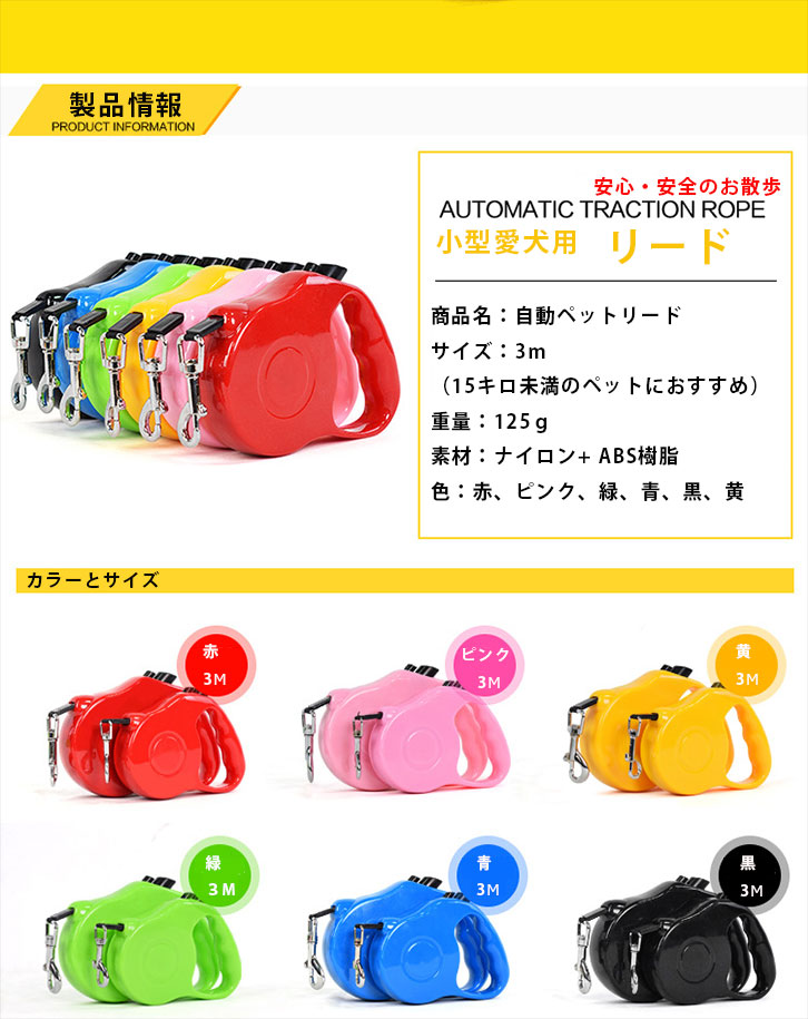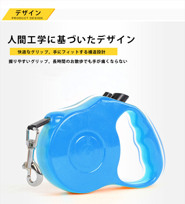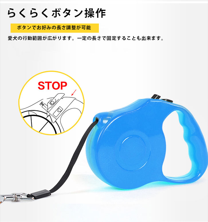 自動巻取り式リードで、ワンちゃんの動きに合わせて長さ3Mまで自由に伸び縮みし、ワンちゃんへの負担を軽減。
