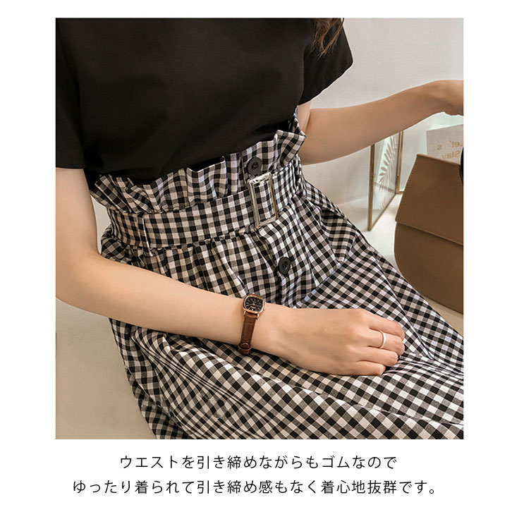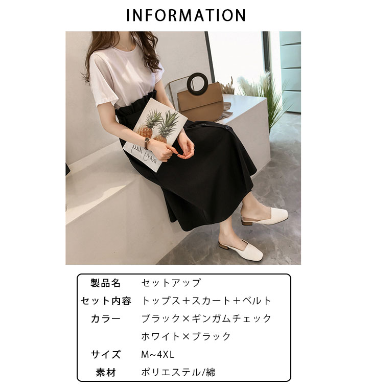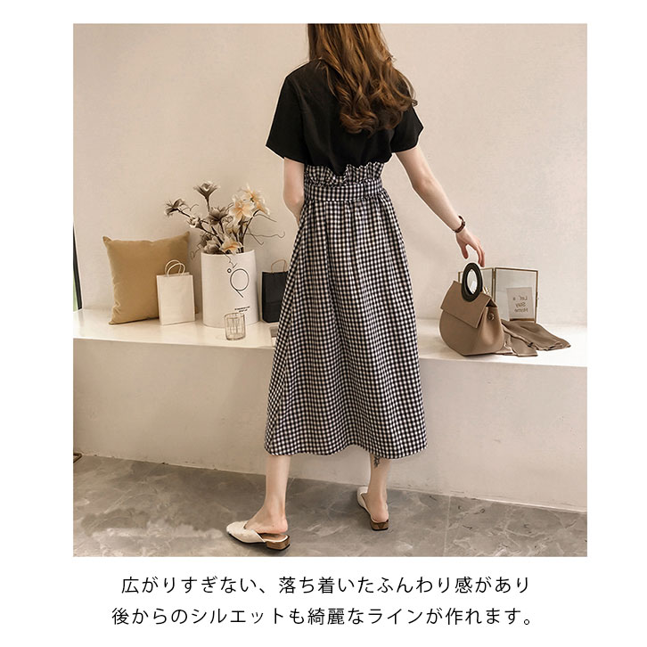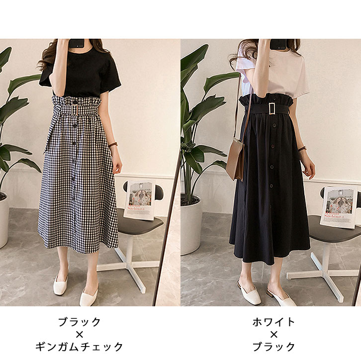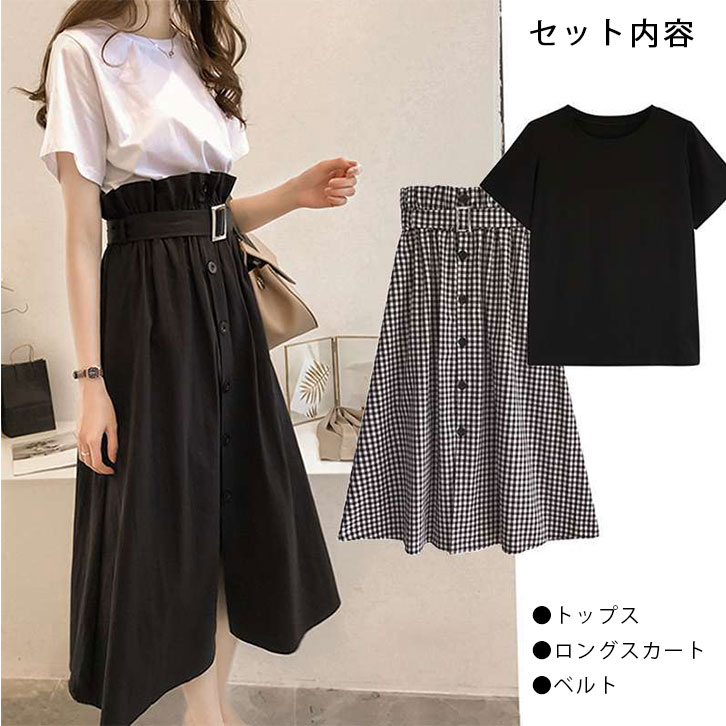 セットアップ レディースファッション Tシャツ ロングスカート モノトーン ギンガムチェック セット 体系カバー ハイウエスト 脚長効果 かわいい オシャレ シンプル 半袖 キレイめ 大人可愛い