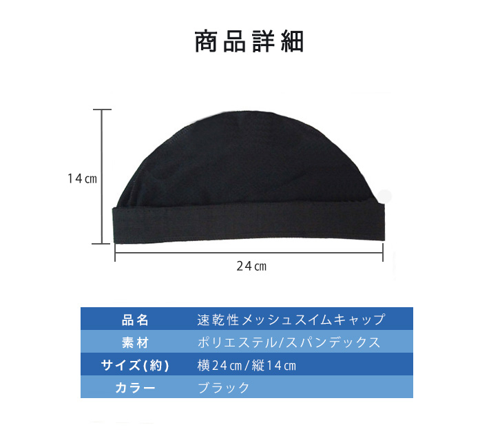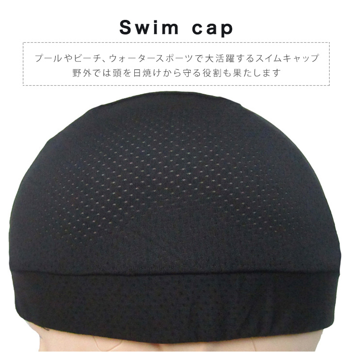 抜群の伸縮性ながらも メッシュ素材で快適な被り心地の スイムキャップになります♪♪ カラーはどんな水着にも合わせやすいブラックです。 通気性はもちろん、速乾性、放熱性も抜群! 蒸れにくく、洗濯後もすぐに乾きます♪ また伸縮性が高いので、ロングヘアの方の 長い髪もまとめて入れやすくなっています☆