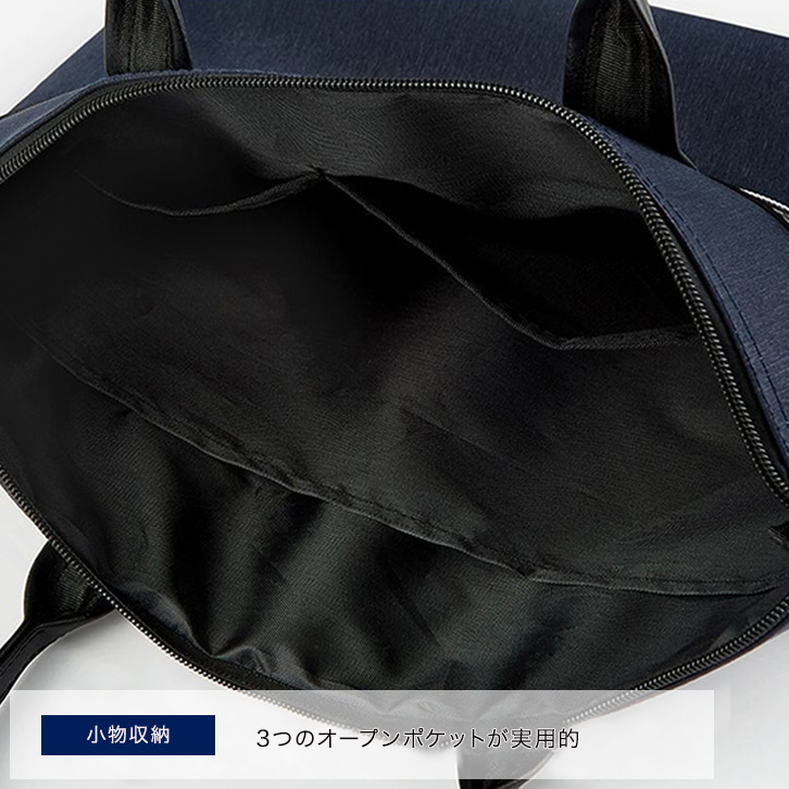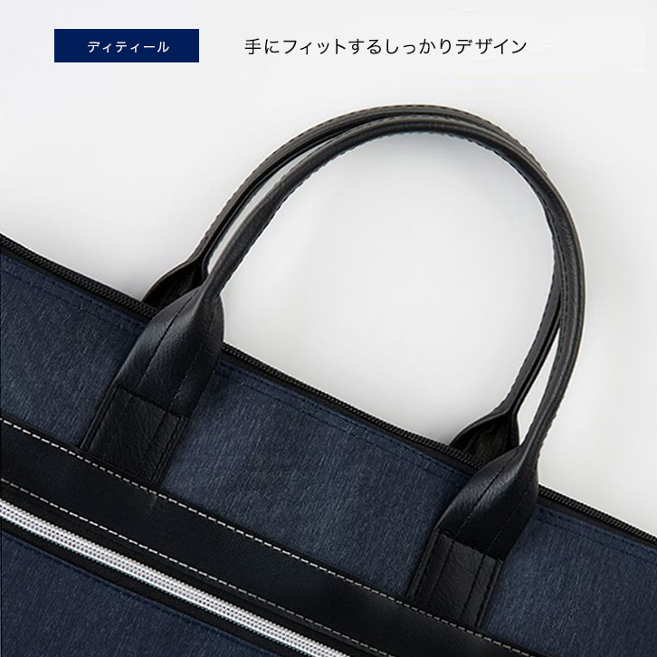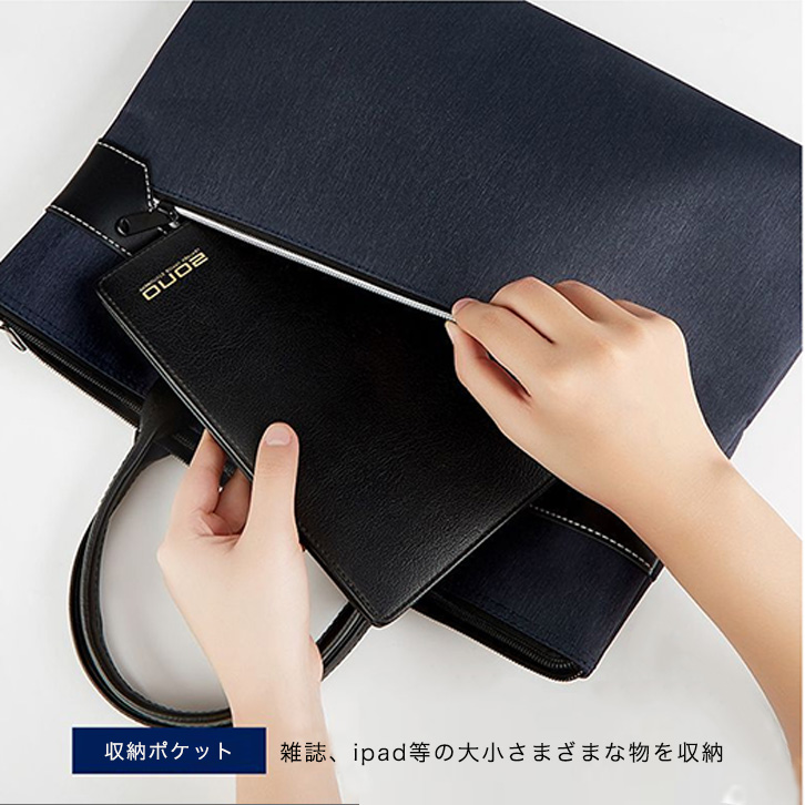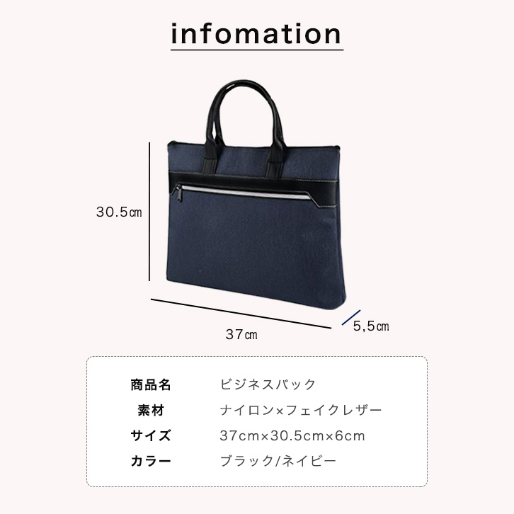 【カラー】ネイビー/ブラック 【サイズ】幅約37×高さ約30.5×マチ約5.5~6センチ ※多少誤差が生じる場合がございます。 ご了承ください。 【素材】ナイロン/フェイクレザー 大容量収納可能! シンプルなデザインながらも どこかオシャレで高級感漂う☆ ビジネスバッグになります。 小物収納ポケットも充実しているので A4書類やファイルはもちろん PCやタブレット類もすっぽり収まります☆