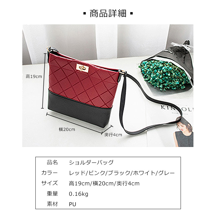 【カラー】レッド/ピンク/ブラック/ホワイト/グレー 【サイズ】高さ約19×幅約20×マチ約4センチ ※多少誤差が生じる場合がございます。 ご了承ください。 【素材】PU バイカラーデザインが可愛い♪ ショルダーバッグになります♪♪ ミニサイズながらもデイリー使いにぴったりな程よいサイズ感なので 日頃持ち歩く必需品の収納にぴったりなのも嬉しいポイント☆ 上品な可愛さがあり、大人カジュアルなミニショルダーバッグ♪