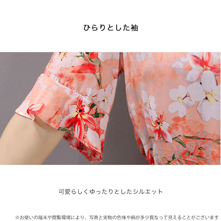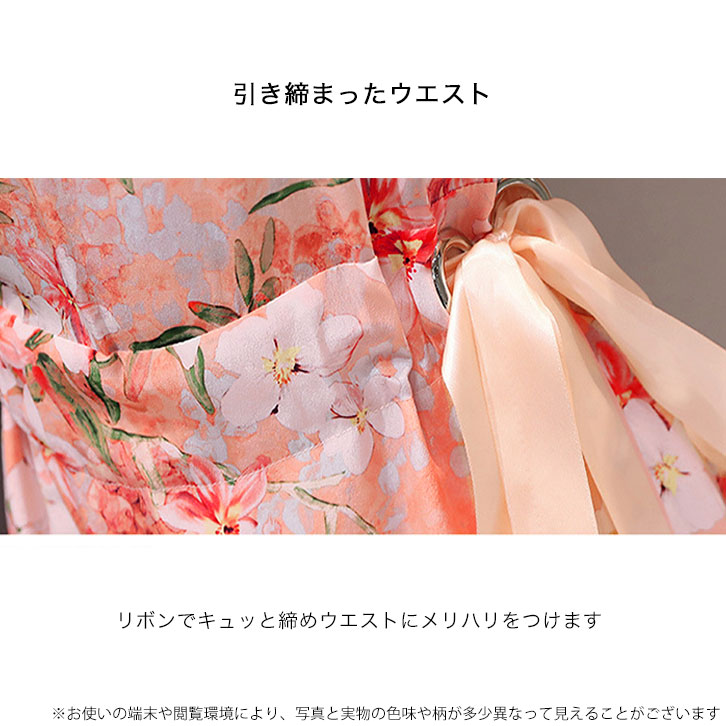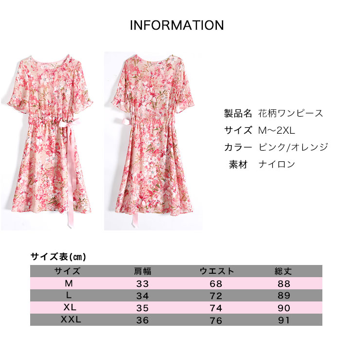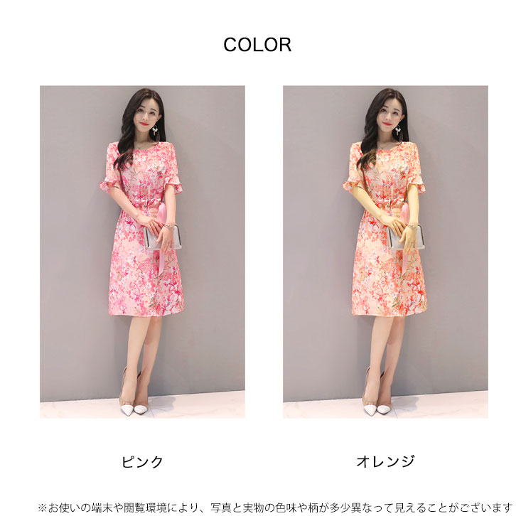花柄ワンピース ワンピース Uネック ピンク オレンジ 五分袖 5分袖 花柄 フラワー 袖フリル春夏 春 夏 デート 女子会 オフィス