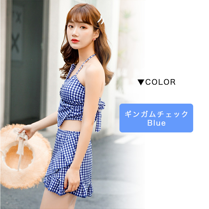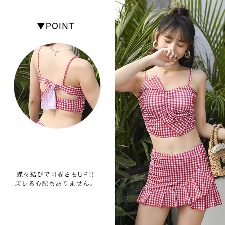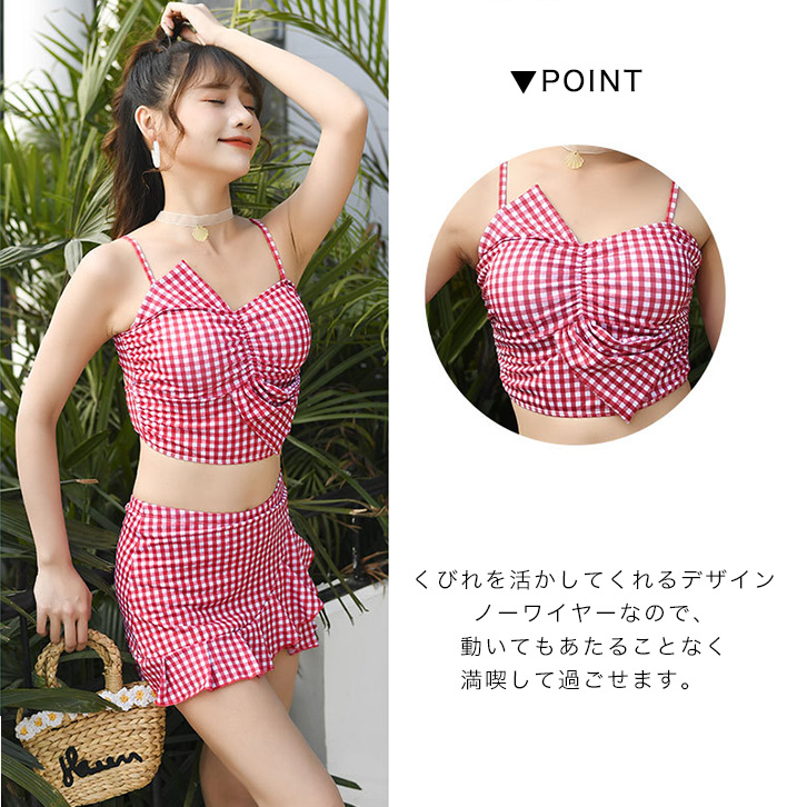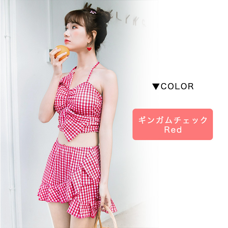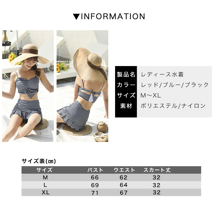 水着 レディース水着 スイムウェア ギンガムチェック 可愛い ノーワイヤー 全3色 レッド ブルー ブラック キュート おしゃれ 上下別 スカートタイプ 海 プール 海水浴 夏 SNS映え