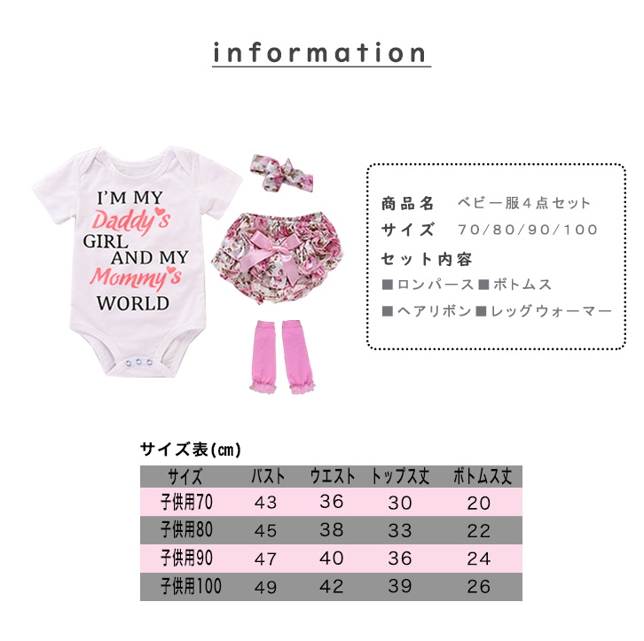 【ベビー服4点セット】ベビー服 セット売り 花柄 ロンパース ボトムス ヘアリボン レッグウォーマー 出産祝い ギフト プレゼント 部屋着 プリント柄 可愛い お洒落 女の子