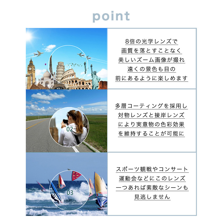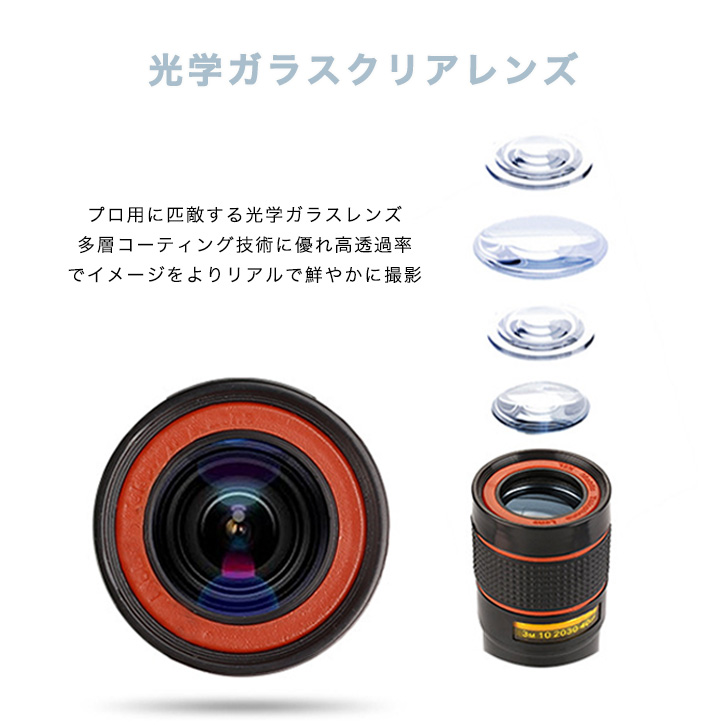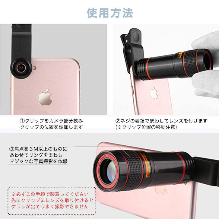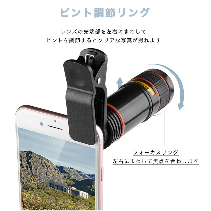 スマホ望遠レンズ 望遠レンズ 光学8倍ズーム クリップ式 簡単装着 取り付け簡単 挟むだけ コンパクト 持ち運び便利 光学ガラスクリアレンズ ピント調節リング 旅行 スポーツ観戦 運動会 発表会
