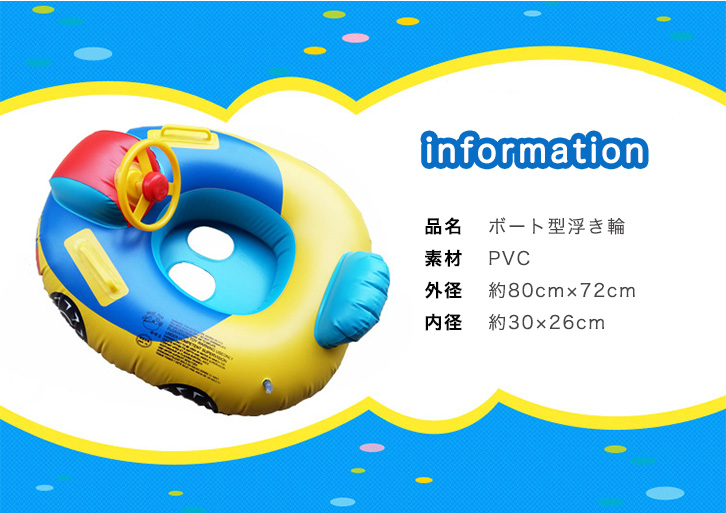 【サイズ】約72×65センチ 足穴部分約11.5×8.5センチ ※多少誤差が生じる場合がございます。 ご了承ください。 小さなお子様もテンションが上がること間違いなし☆ ミニカーボートタイプの浮き輪です♪♪ 海やプールや水遊びに大活躍♪ ハンドル付き&足入れ可能の浮き輪になるので 通常の浮き輪よりも安定感があるのも◎ 【問い合わせ商品コード】 aqua-ta-ry-004