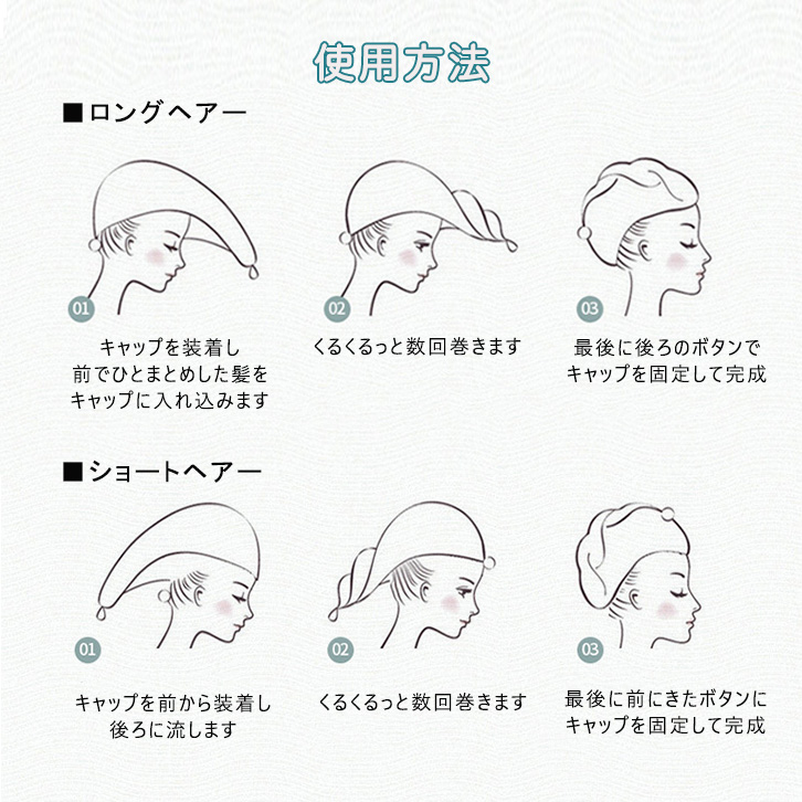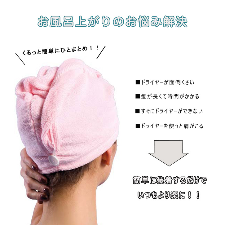 ◆頭にさっと巻くだけで水分を吸収するので、ドライヤー時間を短縮してお風呂上りを優雅に過ごせます。