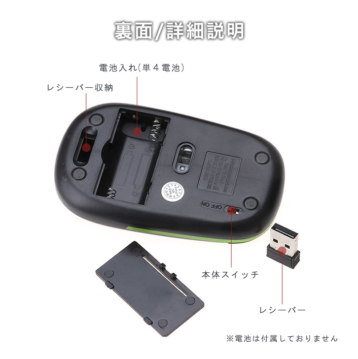 ●小型USBレシーバーはマウス本体裏面に収納できます。