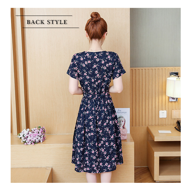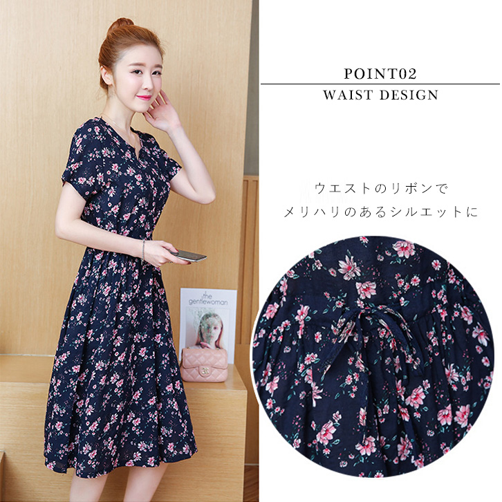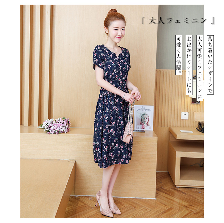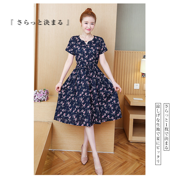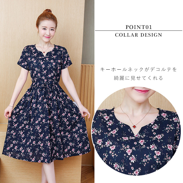 レディースワンピース ワンピース レディース ワンピ 花柄ワンピース フラワー 花柄ワンピ 1枚で決まる ひざ丈 涼しげ 夏 キーホールネック ウエストリボン 美シルエット 細魅せ ネイビー
