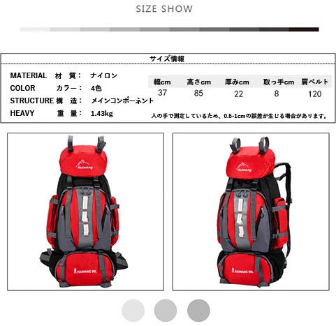 登山バッグ 登山リュック リュック バックパック 旅行鞄 大型リュック 90L 軽量 大容量 ナイロン アウトドア ハイキング 山登り 登山用 旅行用 災害時 家族旅行 長旅 レジャー 旅行 遠出 釣り 90 衣類 寝袋