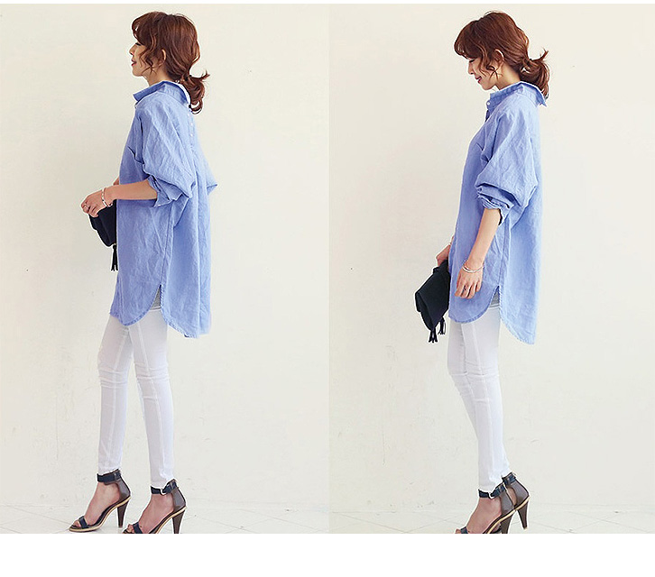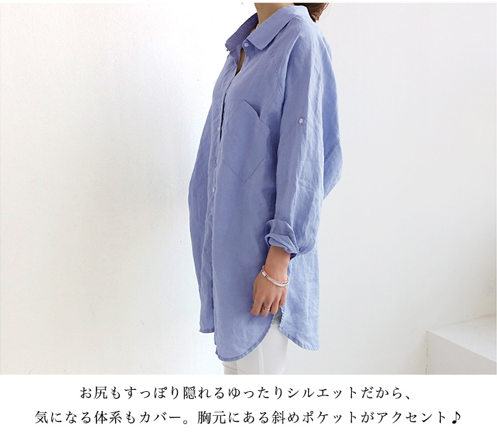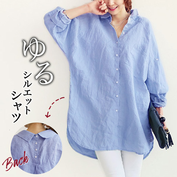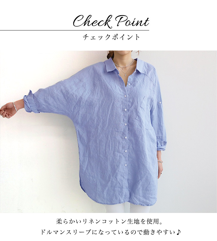 レディースシャツ ゆるシャツ シンプル シャツ シンプルシャツ レディースファッション ゆるシルエット 体型カバー リネンコットン ドルマンスリーブ 長袖 ロング丈 ロングシャツ 胸元ポケット付き