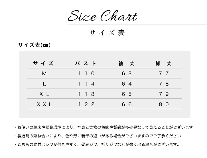Mサイズ/バスト110、袖丈63、総丈77