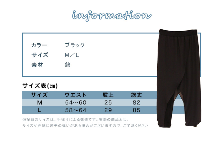 Lサイズ/ウエスト58~64cm、股上29cm、総丈85cm